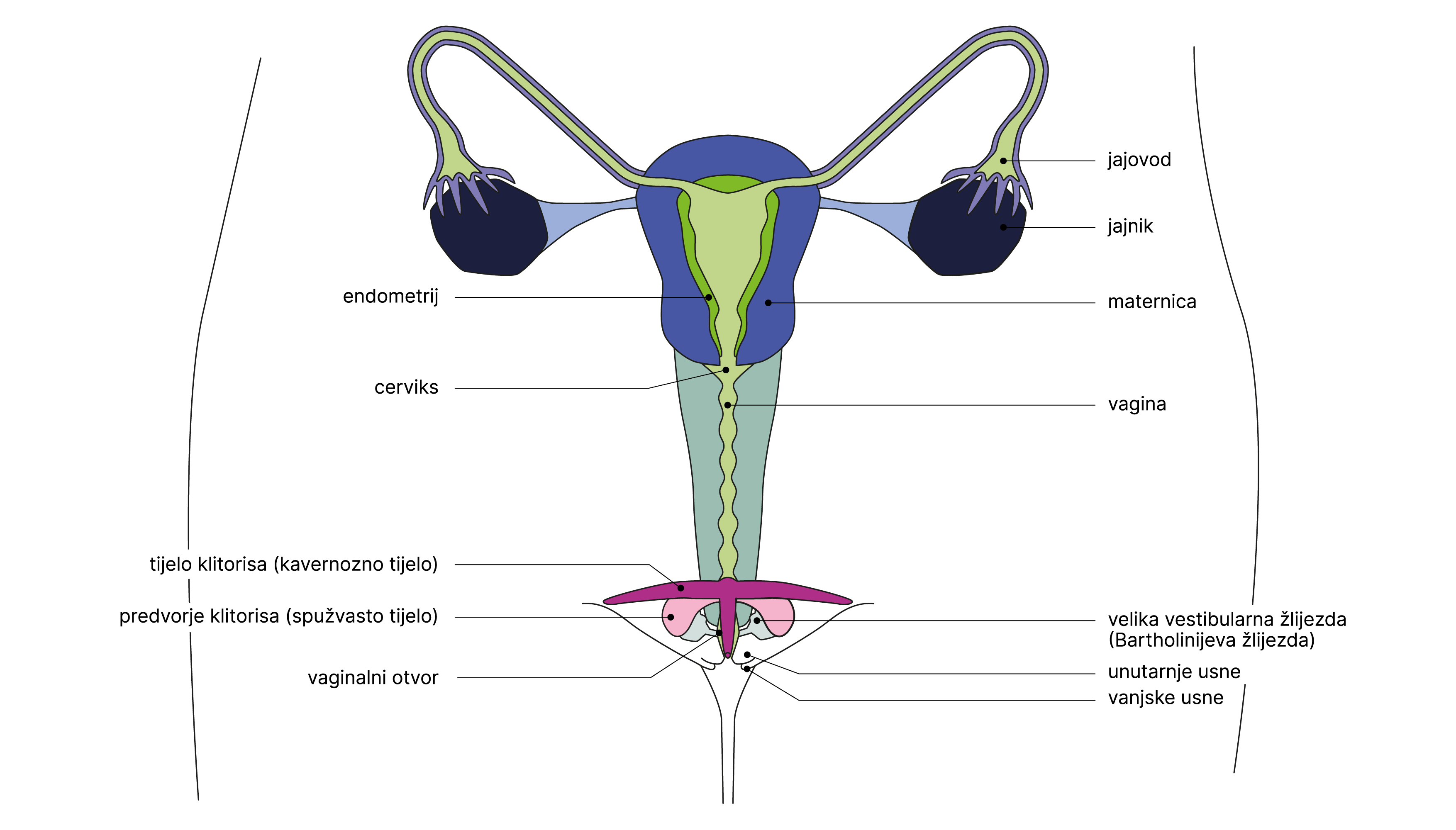 Maternica, jajnici, jajovodi, vagina i neke žlijezde nalaze se unutra.